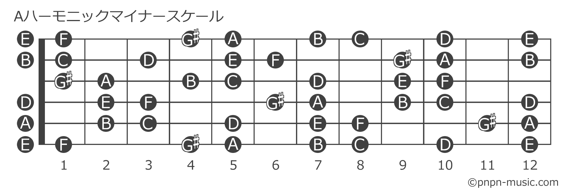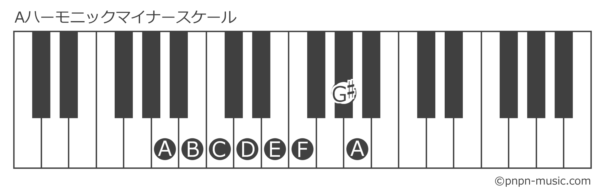 Aハーモニックマイナースケールは、Aナチュラルマイナースケールの第7音を半音上げて作られるスケール。